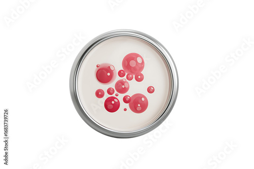 sample, container, circular, metallic, creamy, off-white, droplet, round, variation, size, mixture, reaction, texture, distribution, contrast, detail, scientific, cosmetic, artistic, representation, laboratory, research, experiment, science, product, beauty, colours, pink, red, white, cream, circle, rim, closeup, macro, photo, image, visual, illustration, analysis, test, study, observation, pigment, substance, fluid, liquid, blob