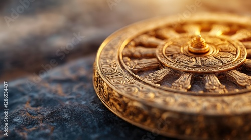 A detailed golden Dharma Wheel resting on textured stone, symbolizing the Buddhist path, enlightenment, and spiritual journey
