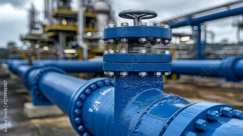 A detailed illustration of blue industrial pipes connected to an oil refinery, highlighting the complex infrastructure for transporting crude oil and refined products.