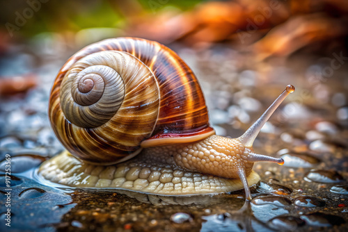 A detailed image of a snail with a spiral shell moving on a wet, rocky surface, displaying its unique texture