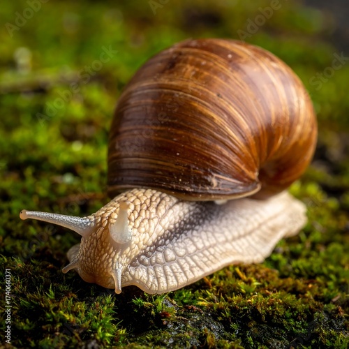 snail, macro, closeup, moss, green, brown, shell, texture, wildlife, nature, garden, creature, invertebrate, slow, slimy, eye, antennae, detail, sharpened, environment, damp, growth, organic, natural, surface, background, outdoors, image, vibrant, life