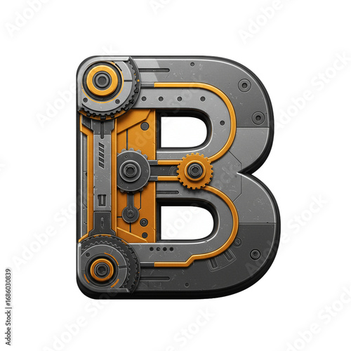 A detailed mechanical letter B, featuring gears, metallic textures, and industrial design elements, suitable for technological or engineering concepts.