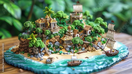 A detailed miniature island scene featuring houses, a ship, and lush greenery.