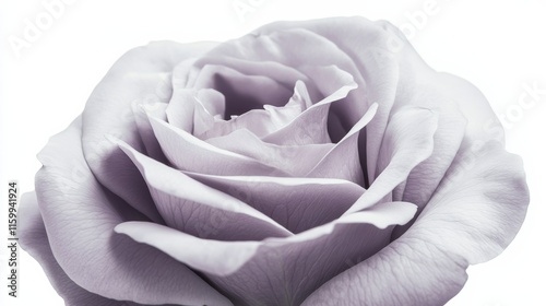 A detailed shot of a soft lavender rose with its layered, velvety petals and subtle color, isolated white background