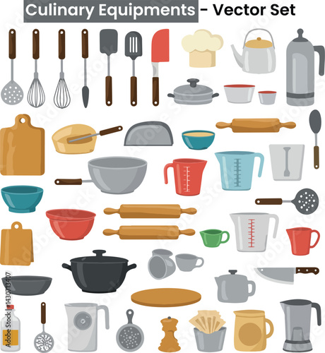 A detailed vector illustration of a diverse collection of culinary equipment, isolated on a white background