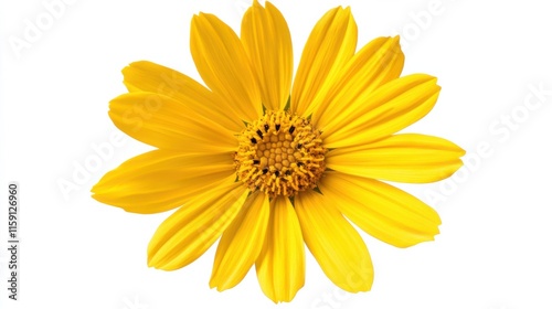 A detailed view of a bright yellow daisy with its petals radiating from a central core, isolated white background, minimalistic art style