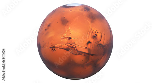A detailed view of Mars, showcasing its rusty surface, canyons, and polar ice cap.