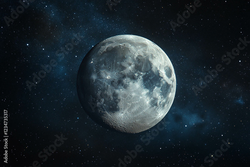 A detailed view of the moon against a starry night sky, showcasing its craters and surface texture, with a dark cosmic background.