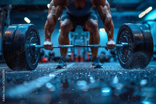 A determined athlete performs a heavy deadlift in a modern gym, showcasing muscular strength and intense focus during a workout.