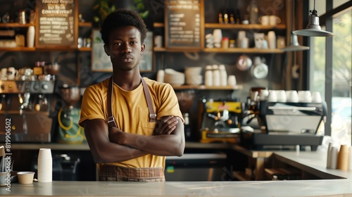 A determined young coffee shop owner stands at the counter, their entrepreneurial spirit shining through as they prepare to tackle another busy day.