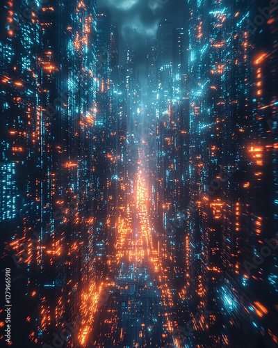 A digital cityscape with glowing interconnected cubes in a cyberpunk style, highlighted by cinematic lighting