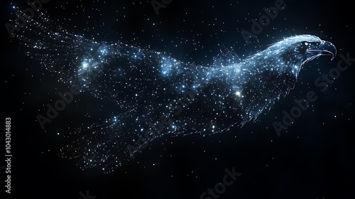 eagle, bird, soaring, fly, flight, night, sky, star, galaxy, space, universe, digital, abstract, art, graphic, design, futuristic, technology, particle, glow, light, bright, freedom, power, symbol, strength, hope, inspiration, ambition, success, future, dream, imagination, fantasy, mystical, magical, aethereal, beautiful, elegant, majestic