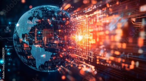 A digital image showing a spinning globe, a circuit board, and a graph. This image represents the connections between technology, globalization, and business.
