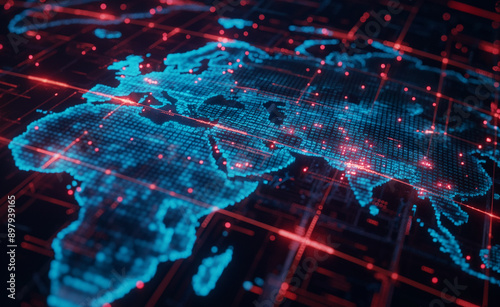 digital, map, europa, africa, asia, glowing, blue, red, datum, point, network, line, technology, futuristic, tech, information, cyber, earth, continent, geography, abstract, design, modern, global, connectivity, high technology, interface, communication, visualisation, electronic, system, cyberspace, science, three-dimensional, illustration, web, pattern, geographic, background, computer, grid, connection, space, concept, fractal, arrangement, texture, energy