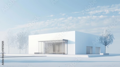 architecture, no people, modern, outdoors, design, building exterior, blue, white color, window, empty, door, built structure, facades, day, wall, new, large, business, nature, vanishing point, industry, futuristic, lifestyle, entrance, construction industry, winter, flooring, clean, landscape, blank, wide, space, copy space, clear sky, grass, concrete, homeownership, warehouse, environment, tree, glasses, material, background, cloud, sky, snow