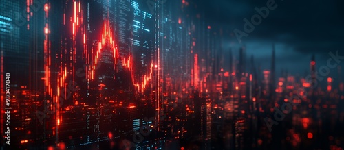 A digital visualization of fluctuating data trends in a futuristic cityscape.