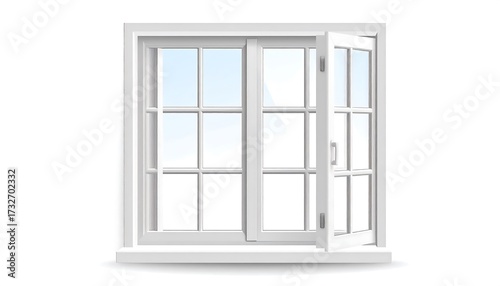 A digitally created illustration shows a white, double-hung window, one pane opened slightly, with a blue sky visible
