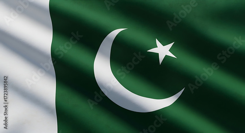 A digitally created image showcases the flag of pakistan, featuring a vibrant green field with a white crescent moon and a fivepointed star, alongside a white stripe on the hoist side, symbolizing the