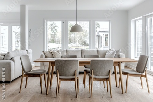 A dining room with minimalist, white-finished walls and a Scandinavian interior design with a view of the living room. Generative AI