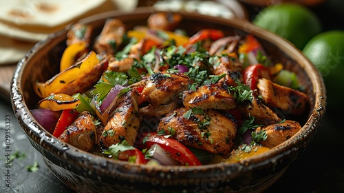 A dish of flavorful chicken fajitas, served with tortillas.