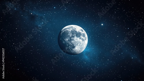 A distant view of the moon floating in the vastness of space, with stars twinkling in the dark background, providing a cosmic scene with ample space for copy.