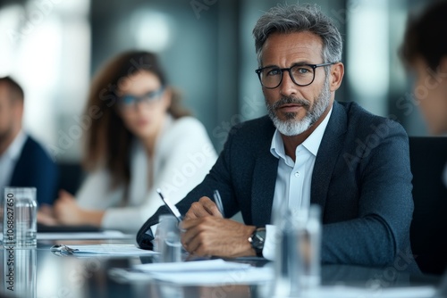 A distinguished business leader listens attentively during a corporate meeting, surrounded by colleagues in a sleek office environment, conveying leadership and strategy.