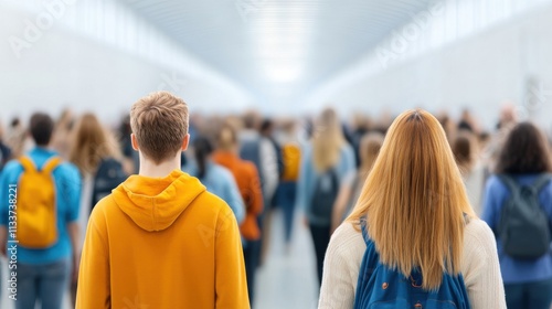 crowd, people, diversity, indoor, walking, oneness, student, interaction, gathering, togetherness, engagement, hallway, excitement, harmony, motivation, movement, teamwork, exploration, dynamic, perspective, youth, learning, community, atmosphere, social, friendship, school, creativity, sharpened, journey, expression, growth, connection, life events, enthusiasm, energy, pathway, backpack, modern, lifestyle, style, fashion, destination, surrounding, colours, activity, casual attire, adventure, travel