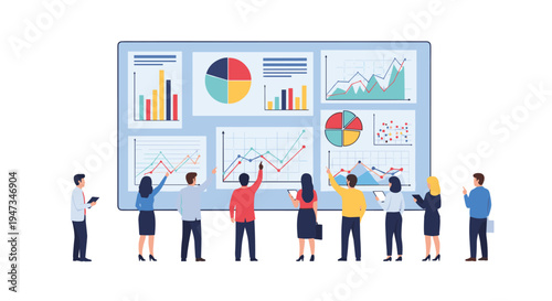 A diverse group of business professionals stands before a large screen displaying various data charts and graphs, pointing and discussing.