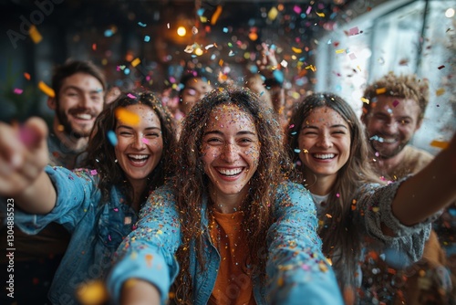 confetti, celebration, joy, friends, group, diverse, smiling, laughing, togetherness, party, event, happy, excited, fun, festive, gathering, cheerful, happiness, oneness, friendship, enjoyment, laughter, merriment, vibrant, positive, moment, occasion, social, human relationships, connection, community, youth, generation, young adult, joyful, smile, carefree, amusement, revelry, entertainment, festivity, people, person, emotion, expression