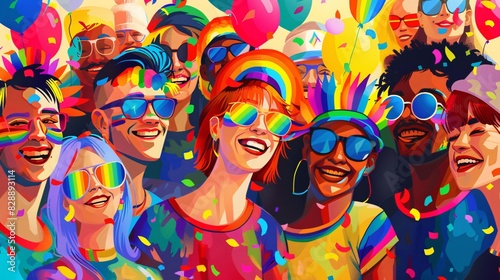 A diverse group of people, each wearing colorful rainbow accessories, gather together in a joyful parade. The scene is filled with smiling faces and lively energy, showcasing the spirit of unity and