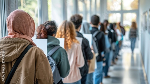 line, people, waiting, diverse, group, hallway, queue, indoor, sunlight, bright, standing, crowd, anticipation, student, casual attire, backpack, multicultural, daytime, window, social, room, lineup, gathering, event, modern, corridor, perspective, tied-up, community, public, interaction, urban, organised, wear, everyday, life
