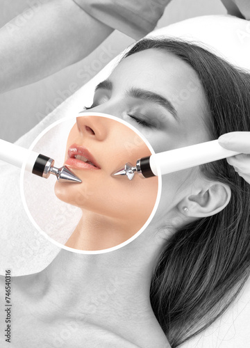 A doctor cosmetologist makes a microcurrent facial therapy to a young woman with a device in a beauty wellness salon. Cosmetology and professional skin care.