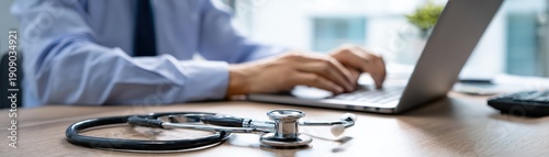 A doctor or medical professional is typing on a laptop with a stethoscope placed on the table, symbolizing healthcare and technology integration.