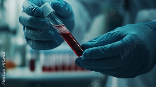 A doctor wearing medical gloves holds a blood tube labeled as a positive Monkeypox (Mpox) virus blood sample.
