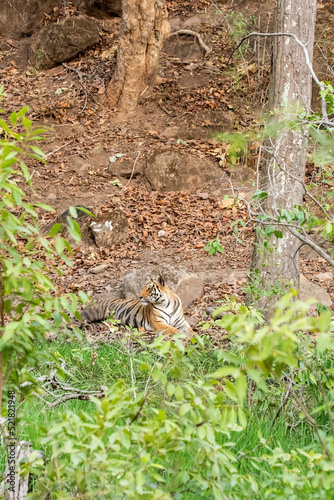 A dominant tigress relaxing below a tree on a peak summer day inside Bandhavgarh National Park during a wildlife safari
