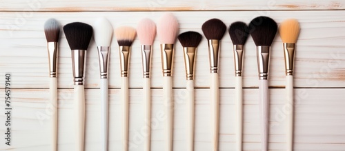 A dozen professional makeup brushes are neatly lined up in a row on a white wooden background. The assortment includes highlighter, sculptor, powder, kabuki, blush, and sculpting brushes.
