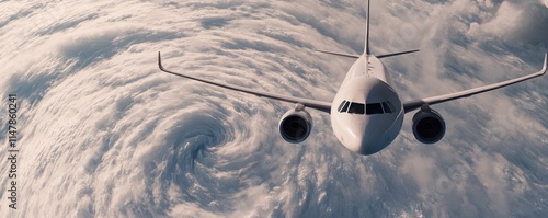 A dramatic aerial view of an airplane navigating above a swirling storm cloud, showcasing the power of nature and aviation.