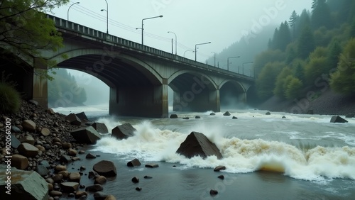 A dramatic image of a concrete bridge spanning a turbulent river during a flood. The scene is shrouded in mist, with power lines visible along the bridge. Debris and large concrete blocks are being sw