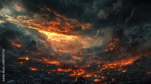 A dramatic landscape depicting an apocalyptic scene with fiery lava, dark clouds, and a glowing sky, creating a sense of chaos and destruction.