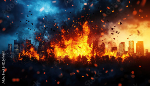 fire, city, destruction, flames, smoke, impact, inferno, visual, spark, horror, rescue, lighting, darkness, explosion, high-coloured, disaster, crisis, emergency, skyline, heat, apocalypse, terror, building, power, catastrophy, contrast, scene, conflict, threat, chaos, intensity, survival, night, energy, warfare, danger, ash, evacuation, ash, urban, devastation, nature, environment, landscape