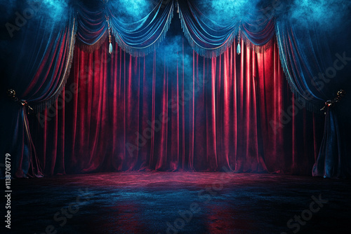 A dramatic stage backdrop featuring rich red and blue curtains with ornate gold trim. The scene is illuminated with soft lighting, creating a mystical atmosphere with smoke effects.