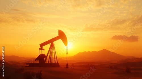 A dramatic sunset illuminates an oil pumpjack silhouetted against the desert landscape.