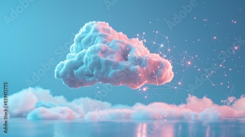 A dreamy, ethereal representation of cloud computing technology with a floating cloud and digital connections set against a soft blue background. 3D Illustration.