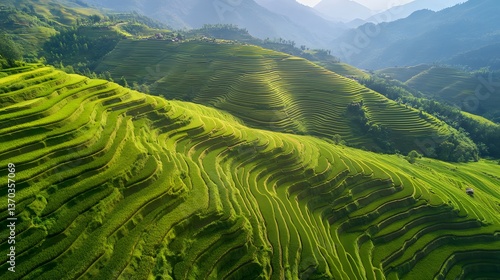 drone, shot, massive, terraced, rice, farm, blending, natural, geometric, beauty, landscape, nature, sky, mountain, grass, green, summer, field, mountain, meadow, forest, hill, rural, tree, vale, view, cloud, spring, scenery, cloud, countryside, agriculture, travel, hill, country