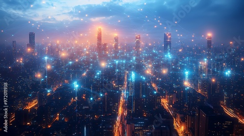 A drone’s-eye view of a futuristic city lit up by glowing data cables and wireless signals, connecting every building and transportation hub.