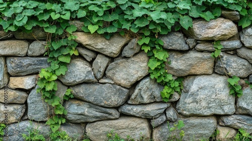 A dry stone wall made of rough-hewn rocks, with greenery growing in the gaps