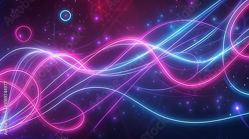 A dynamic neon lights pattern with glowing neon lines and circles in electric blue, purple, and magenta hues against a dark background