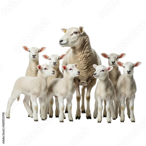 A ewe stands protectively with her group of young lambs. This image captures the essence of a sheep family, ideal for themes of agriculture, nature, and animal care.