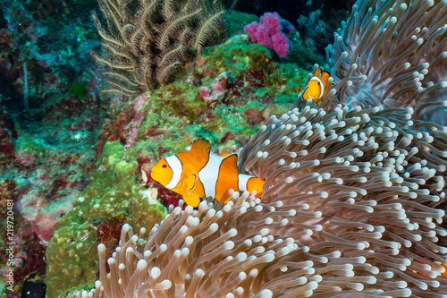 A family of cute False Clownfish in their home on a tropical coral reef