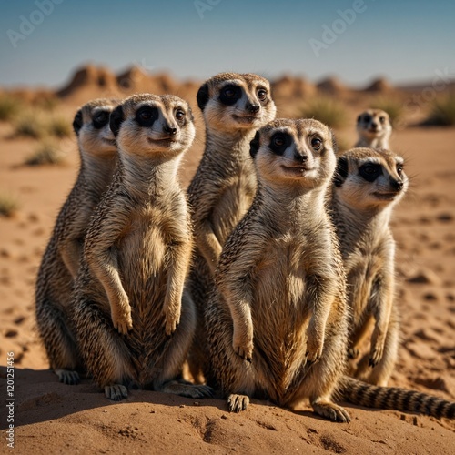 A family of meerkats standing upright and scanning the horizon in a dry savannah. "A group of meerkats standing on alert, their curious faces looking out on a white background."